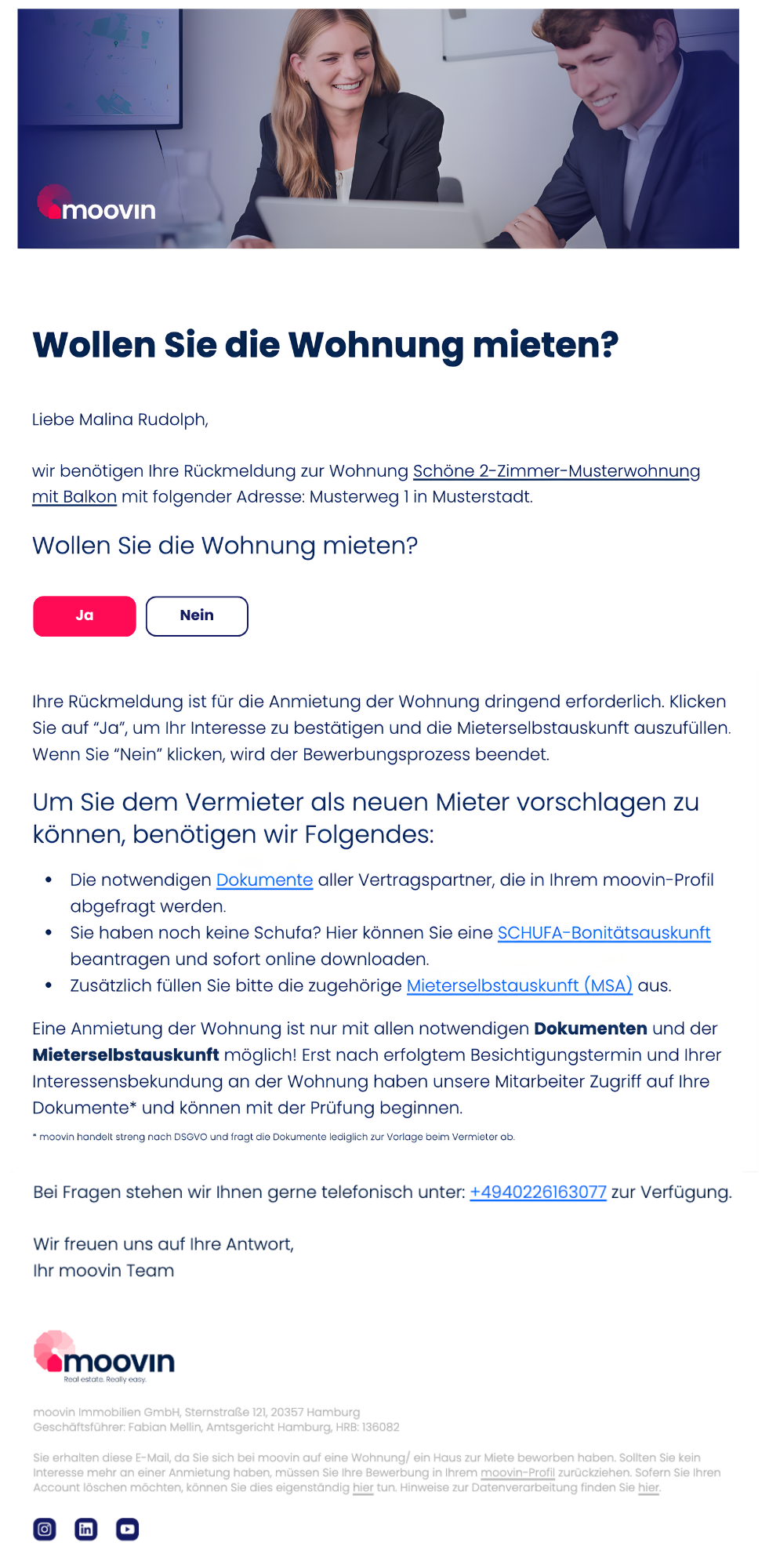 Digitale Rückmeldung: Sie erhalten nach der Besichtigung eine E-Mail. Bitte bestätigen Sie Ihr Mietinteresse ausschließlich über den dortigen Button.