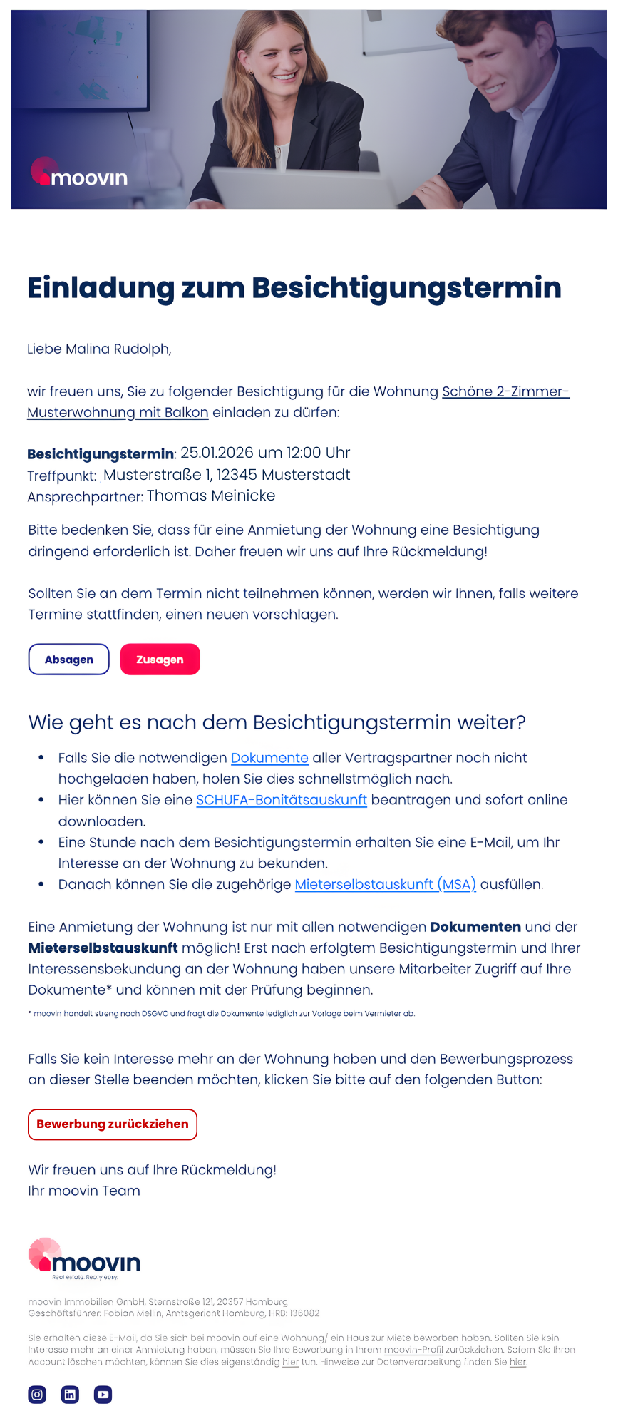 Bitte beachten Sie, dass ein alternativer Termin nur dann angeboten werden kann, wenn weitere Besichtigungen von unserem Vermietungsteam geplant werden und stattfinden.